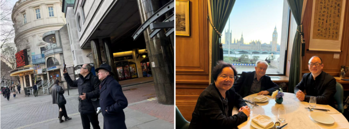 随后,三人一同步行穿越伦敦市中心,城市街景成为交流的背景,学术讨论在行走中自然延续。上图左为建筑学家李麟学教授在途中随机拍摄的街景照片,用以记录并捕捉城市细节中的设计灵感;右图为三人抵达泰晤士河南岸 County Hall 临江餐厅后的合影,窗外可见泰晤士河与英国议会大厦。刚一落座便合影留念,彼时对岸的大本钟与议会大厦清晰可见;待晚餐开始,夜色渐深,窗外景致逐渐隐入伦敦暮色之中,为这一跨文化学术交流的行程留下一个具有象征意义的收束时刻。