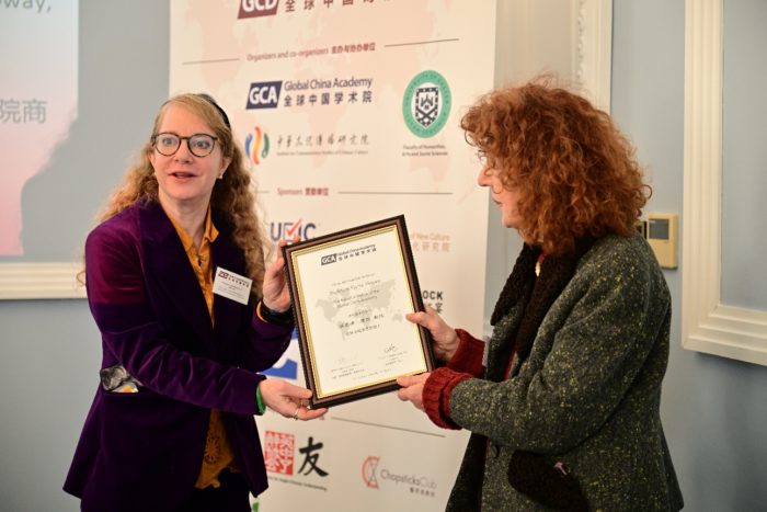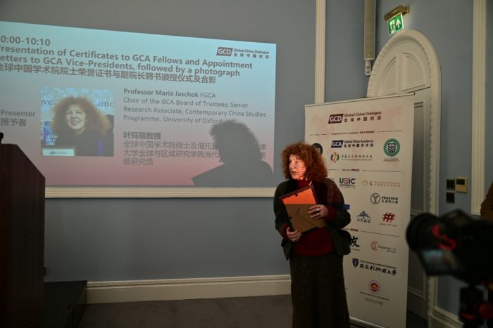 Professor Maria Jaschok, FGCA, Chair of GCA Board of Trustees; Senior Research Associate of the Contemporary China Studies Programme, University of Oxford, presented certificates to GCA Fellows.