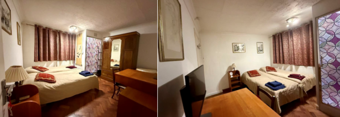 1 twin bedroom (top), 1 double bedroom (bottom), and 2 single bedrooms, all with a shared toilet and shower room.
